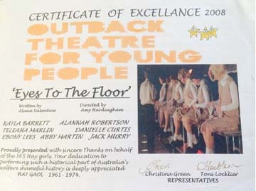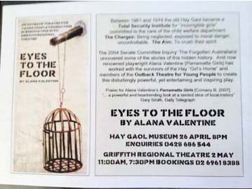 With discussion about a play being created based on the Hay girl's experiences, information was passed on to Bonney. The next day Bonney made contact with the Director of "Out Back Theatre" there in Hay, to discuss the idea and left contact details of Play Writer Alana Valentine with the ending of a great event. As time passed Bonney organized a Hay reunion in March 2007 with around 100 woman attending, and the start of healing for those incarcerated there as teenagers, with Senator Andrew Murray addressing all those attending the Reunion, our group and the local community.